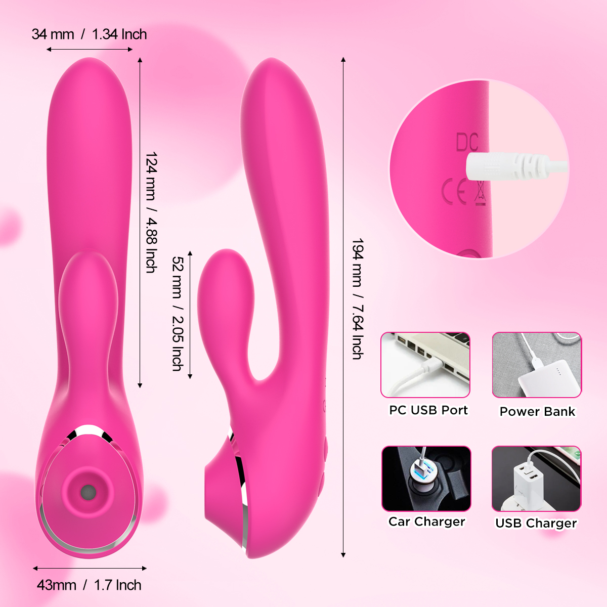 Medidas: 20cm de comprimento, 3cm de largura, 2cm no bocal e 6cm no estimulador;